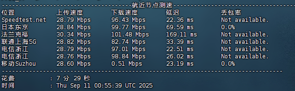- 日本东京节点:上传28.84 Mbps,下载99.77 Mbps,延迟69.59 ms